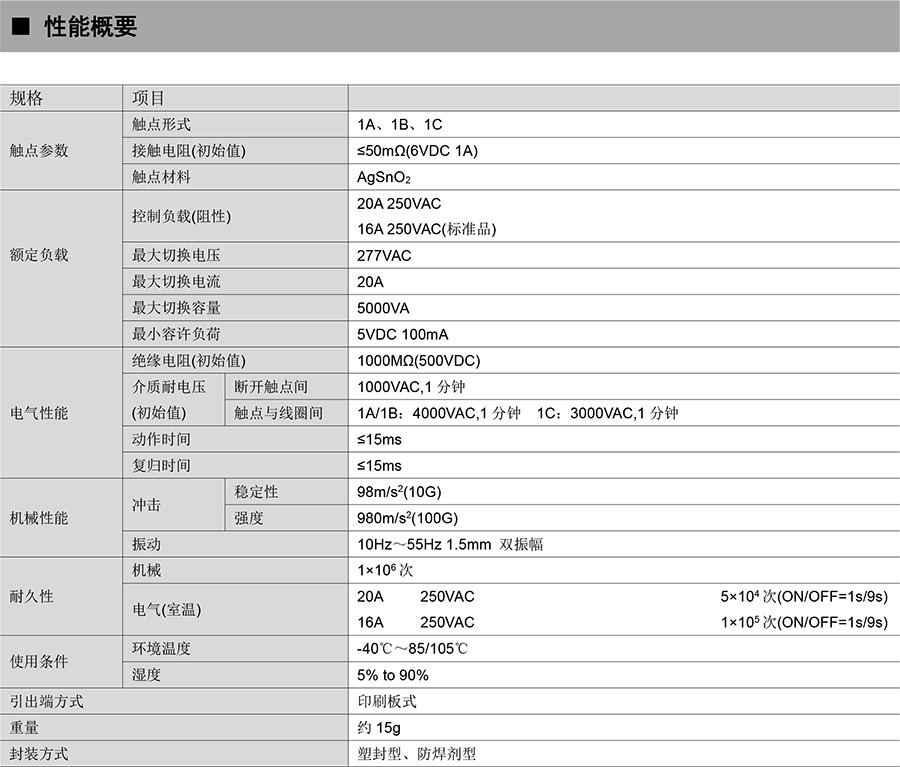 ● 20A 触点切换能力
