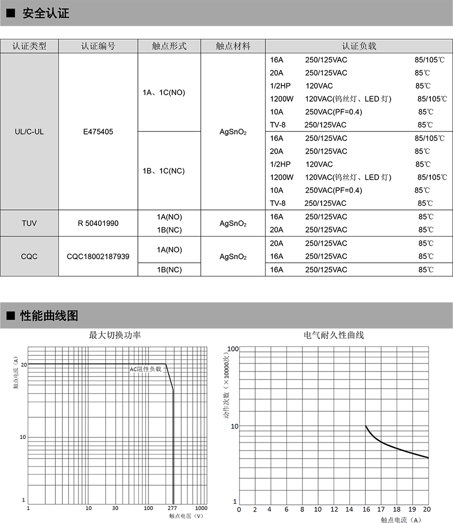 ● 20A 触点切换能力